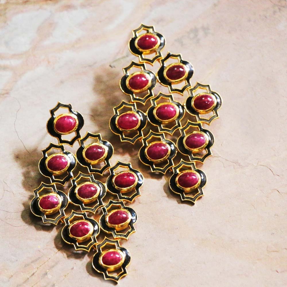 (Inclusive of GST)Sukoon is a love affair with oneself. This irrestible, statement making earring is designed with cabochon Rubies. Its a delight to adorn this gorgeous art-deco inspired pair that spells majestic and luxurious.